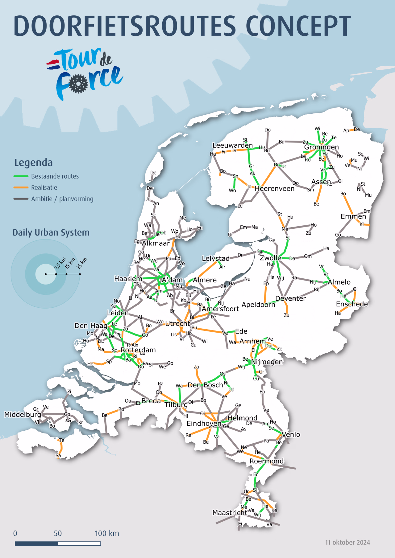 Het jaarlijkse kaartbeeld (zie hieronder) geeft de actuele stand van zaken en de gezamenlijke ambities weer. De Tour de Force biedt hiermee een platform voor provincies, vervoerregio’s en gemeenten om samen de voortgang te monitoren, kennis uit te wisselen en ervaringen te delen.