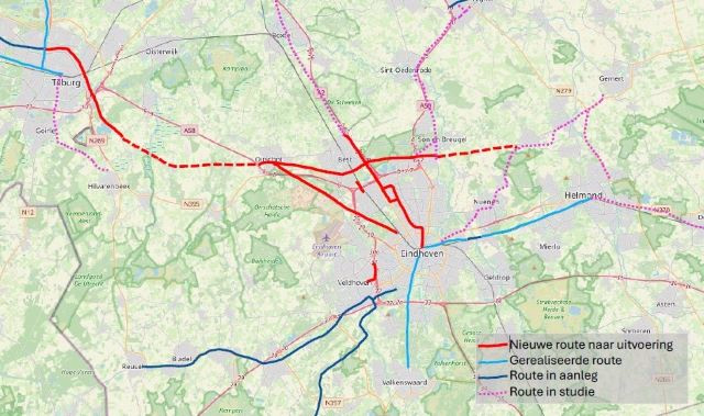 Deze zomer tekenen de provincie en de tien betrokken gemeenten de bestuursovereenkomsten voor de aanleg van de vijf snelfietsroutes. Op één locatie is het werk al begonnen, in de loop van 2025 zou men met alle routes aan de slag moeten zijn.