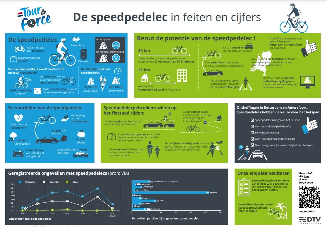 Deze infographic geeft inzicht in het gebruik, de veiligheid en regelgeving rond de speedpedelec. Sinds 2017 wordt dit voertuig als bromfiets beschouwd, wat gevolgen heeft voor de toegestane routes.